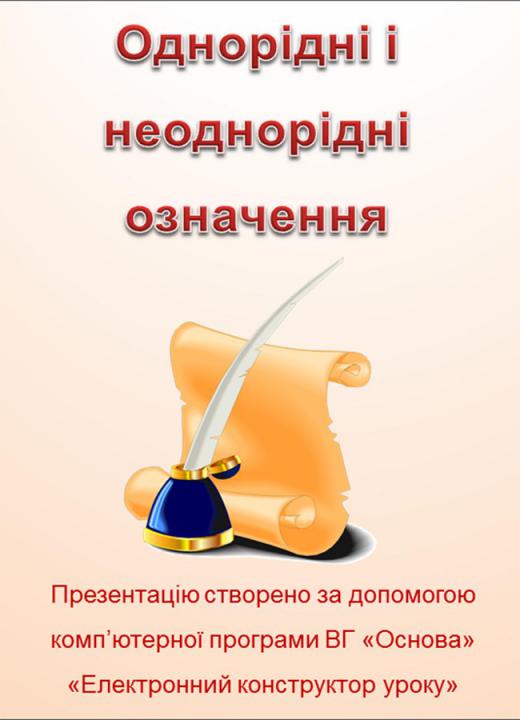 Презентація у форматі ppt (13 слайдів) плюс конспект у форматі doc (4 стор.) до уроку «Однорідні і неоднорідні означення». Презентація складена у повній відповідності з розробкою уроку: базових понять, ілюстрацій, пояснень до них і дидактичних матеріалів. Для вчителів курсу «Українська мова. 8 клас».