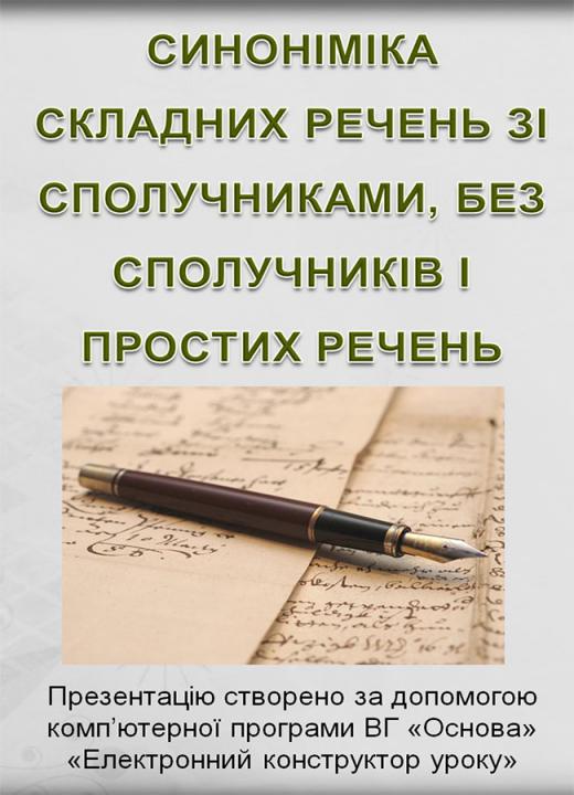 Презентація у форматі ppt (15 слайдів) плюс конспект у форматі doc (5 стор.) до уроку «Синоніміка складних речень зі сполучниками, без сполучників і простих речень». Презентація складена у повній відповідності з розробкою уроку: базових понять, ілюстрацій, пояснень до них і дидактичних матеріалів. Для вчителів курсу «Українська мова. 9 клас».