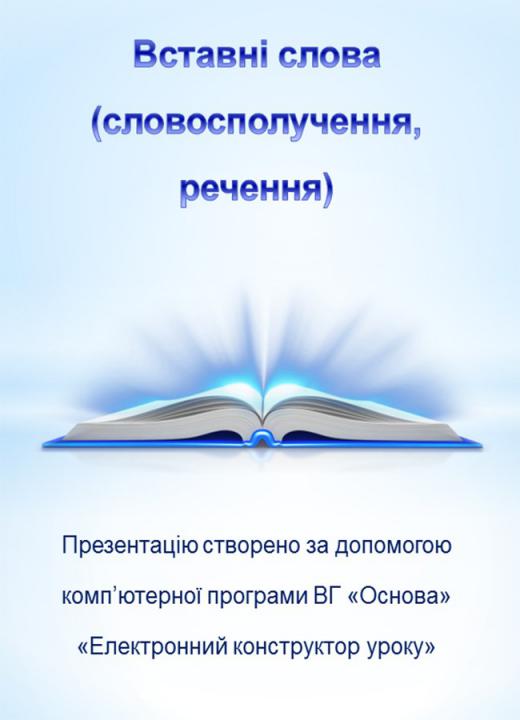 Презентація у форматі ppt (14 слайдів) плюс конспект у форматі doc (6 стор.) до уроку «Вставні слова (словосполучення, речення)». Презентація складена у повній відповідності з розробкою уроку: базових понять, ілюстрацій, пояснень до них і дидактичних матеріалів. Для вчителів курсу «Українська мова. 8 клас».