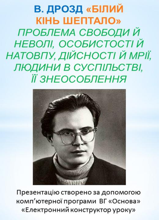 Презентація у форматі ppt (16 слайдів) плюс конспект у форматі doc (11 стор.) до уроку «В. Дрозд «Білий кінь Шептало». Проблема свободи й неволі, особистості й натовпу, дійсності й мрії, людини в суспільстві, її знеособлення». Презентація складена у повній відповідності з розробкою уроку: базових понять, ілюстрацій, пояснень до них і дидактичних матеріалів. Для вчителів курсу «Українська література. 8 клас».