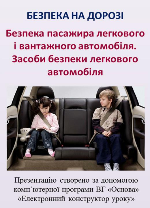 Мета: ознайомити з поняттям «безпека пасажира легкового і вантажного автомобіля», поглиблювати знання учнів про засоби безпеки легкового автомобіля; вчити користуватися підголівниками та пасами безпеки; розвивати навички аналізу дорожньої ситуації; виховувати дисциплінованість, відповідальність, звичку дотримувати правил дорожнього руху для пасажира.