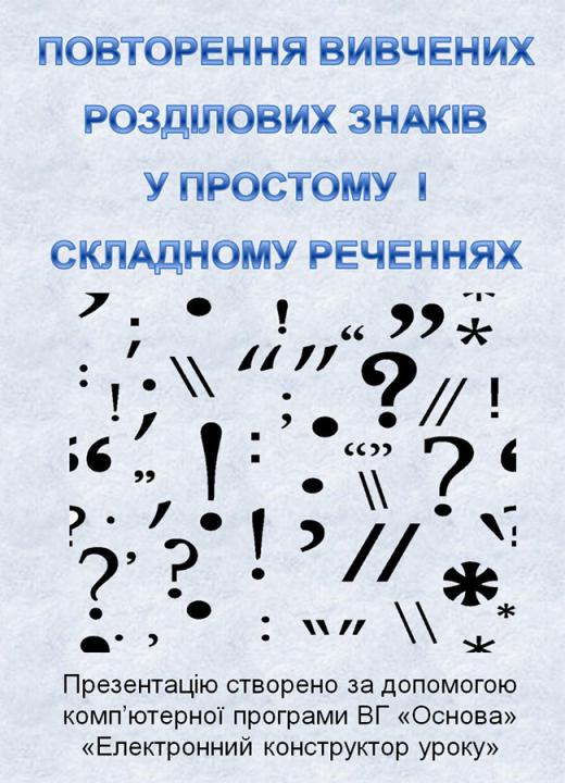Презентація у форматі ppt (13 слайдів) плюс конспект у форматі doc (7 стор.) до уроку «Повторення вивчених розділових знаків у простому і складному реченнях». Презентація складена у повній відповідності з розробкою уроку: базових понять, ілюстрацій, пояснень до них і дидактичних матеріалів. Для вчителів курсу «Українська мова. 9 клас».