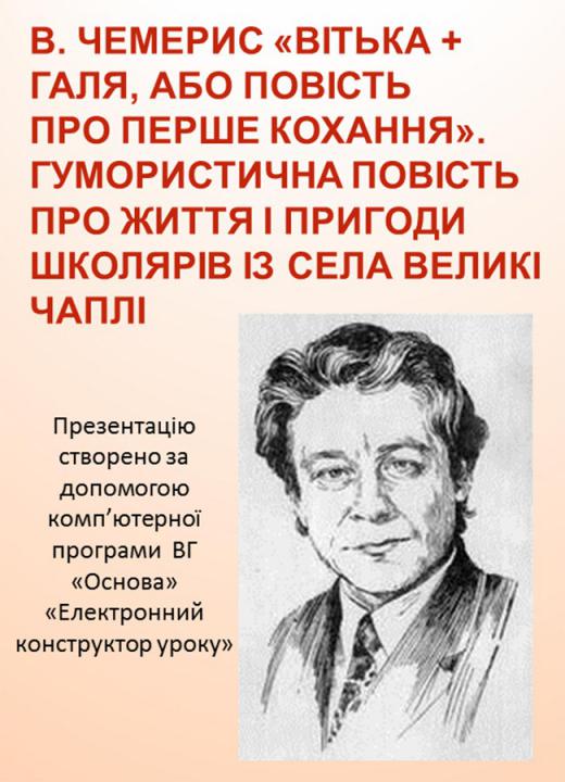 Презентація у форматі ppt (13 слайдів) плюс конспект у форматі doc (8 стор.) до уроку «В. Чемерис «Вітька + Галя, або повість про перше кохання». Гумористична повість про життя і пригоди школярів із села Великі чаплі». Презентація складена у повній відповідності з розробкою уроку: базових понять, ілюстрацій, пояснень до них і дидактичних матеріалів. Для вчителів курсу «Українська література. 8 клас».