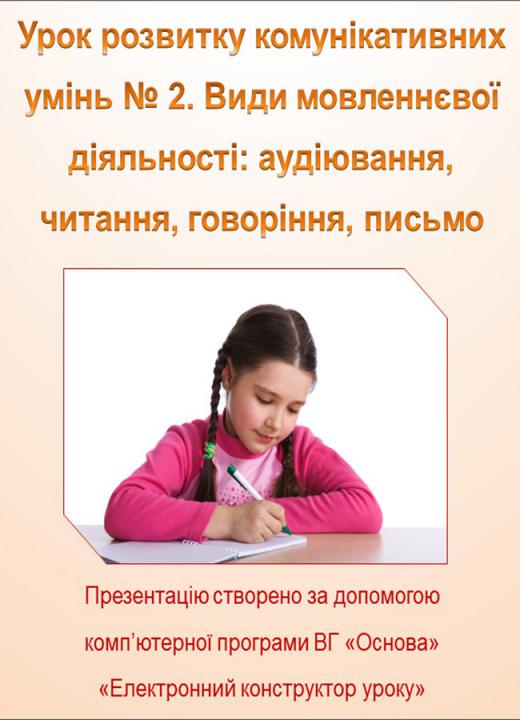 Урок розвитку комунікативних умінь № 2. Види мовленнєвої діяльності: аудіювання, читання, говоріння, письмо. Різновиди аудіювання. Вивчальне читання