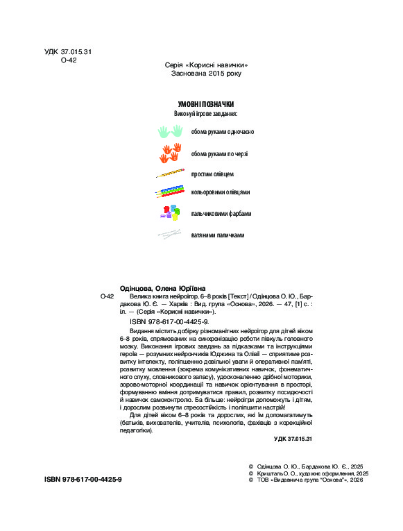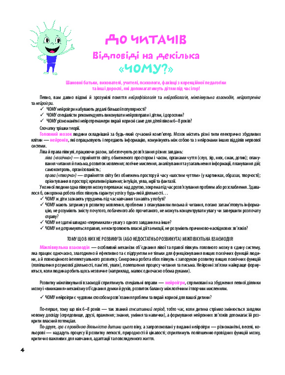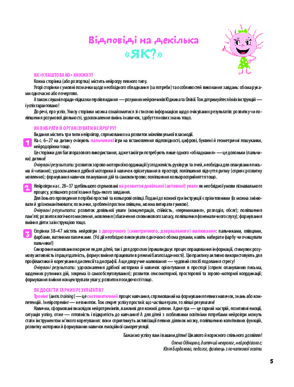 Видання містить добірку різноманітних нейроігор для дітей віком 6–8 років, спрямованих на синхронізацію роботи півкуль головного мозку. Виконання ігрових завдань за підказками та інструкціями героїв — розумних нейрончиків Юджина та Олівії — сприятиме розвитку інтелекту, поліпшенню довільної уваги й оперативної пам’яті, розвитку мовлення (зокрема комунікативних навичок, фонематичного слуху, словникового запасу), удосконаленню дрібної моторики, зорово-моторної координації та навичок орієнтування в просторі, формуванню вміння дотримуватися правил, розвитку посидючості й навичок самоконтролю. Ба більше: нейроігри допоможуть і дітям, і дорослим розвинути стресостійкість і поліпшити настрій!