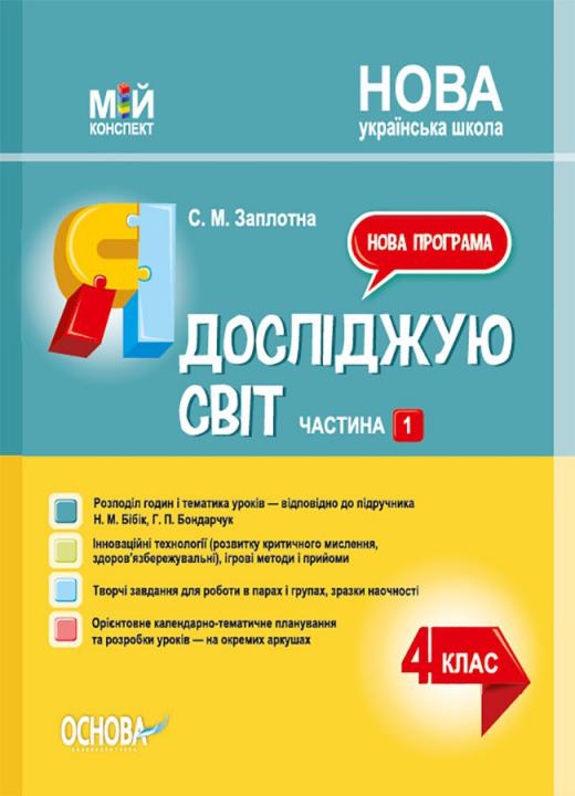 Посібник містить орієнтовне календарно-тематичне планування та розробки уроків інтегрованого курсу «Я досліджую світ» у 4-му класі Нової української школи, складені відповідно до вимог нового Державного стандарту початкової освіти (2018) за Типовою програмою авторського колективу під керівництвом О. Я. Савченко.