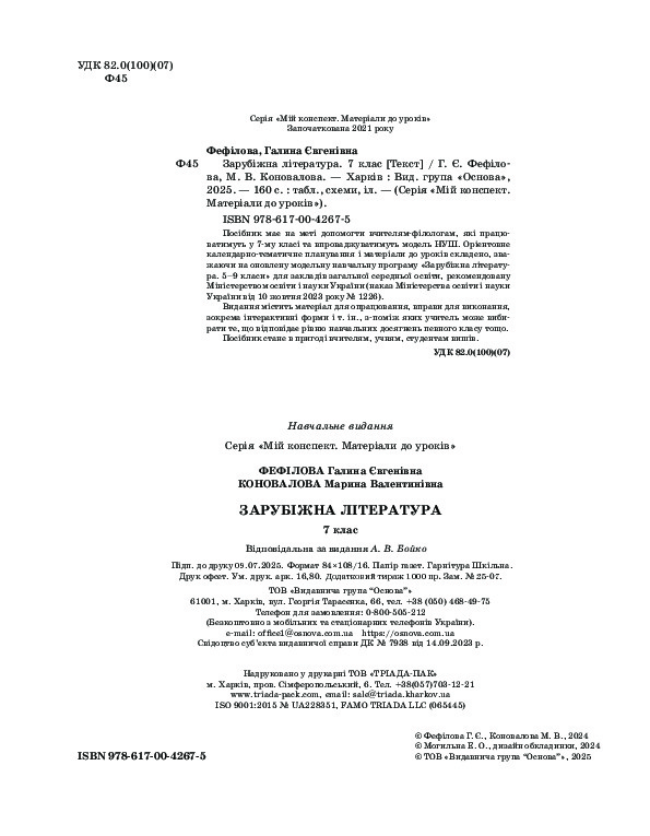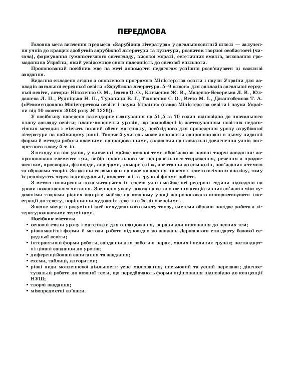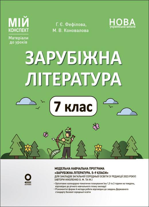 Посібник має на меті допомогти вчителям-філологам, які працюватимуть у 7-му класі та впроваджуватимуть модель НУШ. Орієнтовне календарно-тематичне планування і матеріали до уроків складено, зважаючи на оновлену модельну навчальну програму «Зарубіжна література. 5–9 класи» для закладів загальної середньої освіти, рекомендовану Міністерством освіти і науки України (наказ Міністерства освіти і науки України від 10 жовтня 2023 року № 1226). Видання містить матеріал для опрацювання, вправи для виконання, зокрема інтерактивні форми і т. ін., з-поміж яких учитель може вибирати те, що відповідає рівню навчальних досягнень певного класу тощо. Посібник стане в пригоді вчителям, учням, студентам вишів.