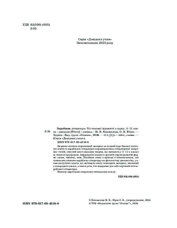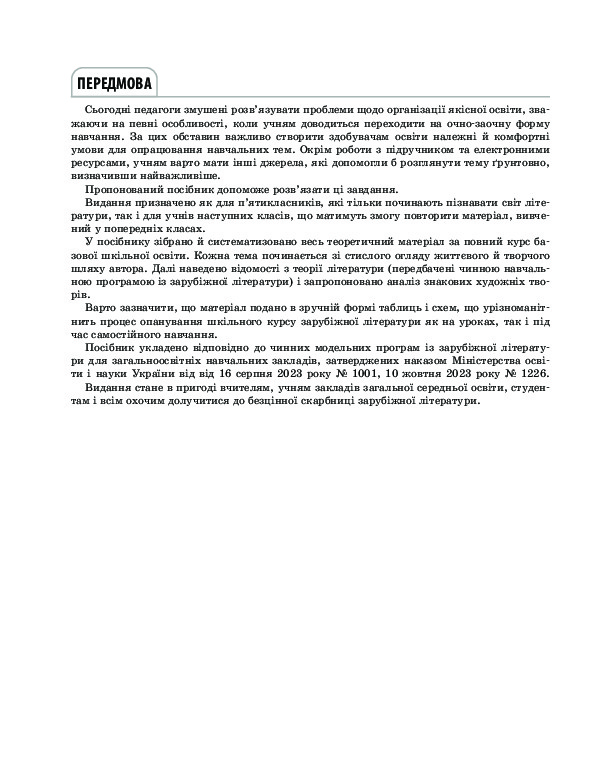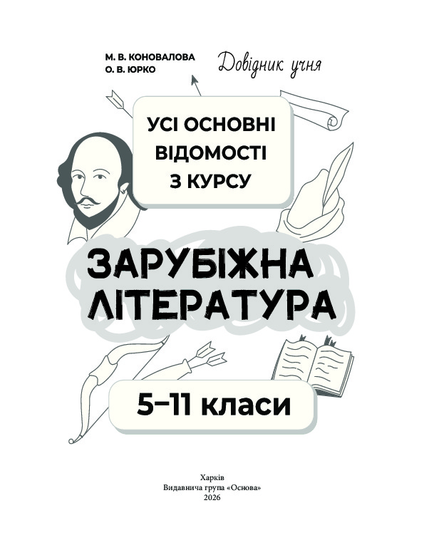 Видання містить теоретичний матеріал за повний курс базової шкільної освіти із зарубіжної літератури (характеристика літературних напрямів і течій, стислий зміст знакових творів), що вивчають у 5–11-х класах за чинною програмою. Інформацію подано в зручній структурованій формі: схеми, таблиці, тези. Посібник стане в пригоді п’ятикласникам, які починають вивчати зарубіжну літературу як філологічну дисципліну, учням наступних класів, що матимуть змогу повторити матеріал, вивчений у попередніх класах, а також усім, хто відкриває для себе чарівний світ зарубіжної літератури.