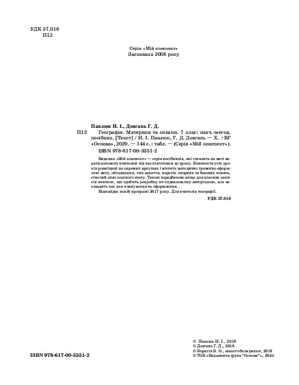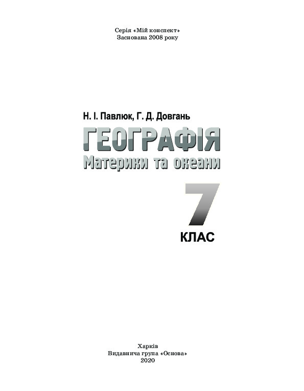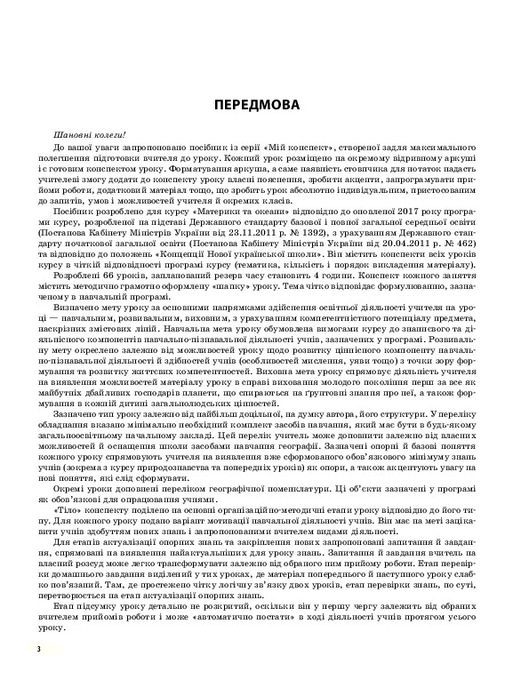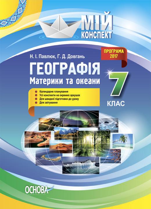 Видання «Мій конспект» — серія посібників, які ставлять на меті надати допомогу вчителеві під час підготовки до уроку. Конспекти усіх уроків розміщені на окремих аркушах і містять методично грамотно оформлені мету, обладнання, тип заняття, перелік опорних та базових понять, стислий опис кожного етапу. Також передбачено місце для власних записів вчителя, що зробить розробку по-справжньому авторською, але заощадить час для планування та оформлення. Відповідає новій програмі 2017 року. Для вчителів географії.