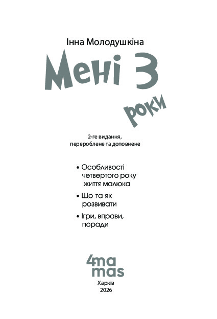 Книга «Мені 3 роки» стане в пригоді всім батькам, які прагнуть дізнатися, як поводитися і правильно реагувати на поведінку малюка четвертого року життя. Тут ви знайдете розвивальні й психологічні вправи, ігри, вірші, тестові завдання. Подані в простій і доступній формі, вони допоможуть привчити дитину до організованості й відповідальності, сприятимуть розвитку творчих здібностей малюка, поглибленню знань про навколишній світ.