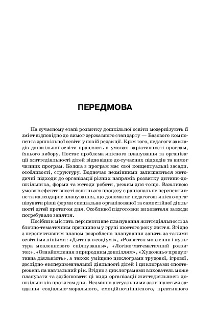 Посібник містить орієнтовне планування організації життєдіяльності дітей шостого року життя за блочно-тематичним принципом. Наведено перспективне планування на весь навчальний рік та планування занять за такими освітніми лініями: «Дитина в соціумі», «Розвиток мовлення і культура мовленнєвого спілкування», «Логіко-математичний розвиток», «Ознайомлення з природним довкіллям», «Художньо-продуктивна діяльність». Також уміщено циклограми трудової, ігрової, дослідно-експериментальної діяльності дітей і циклограми спостережень на навчальний рік, на основі яких складаються календарні плани.