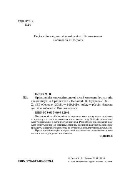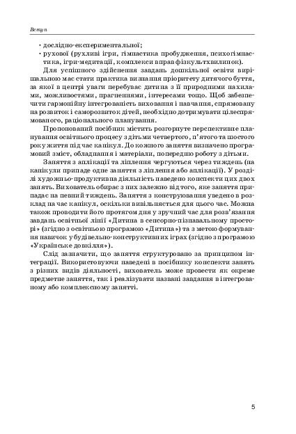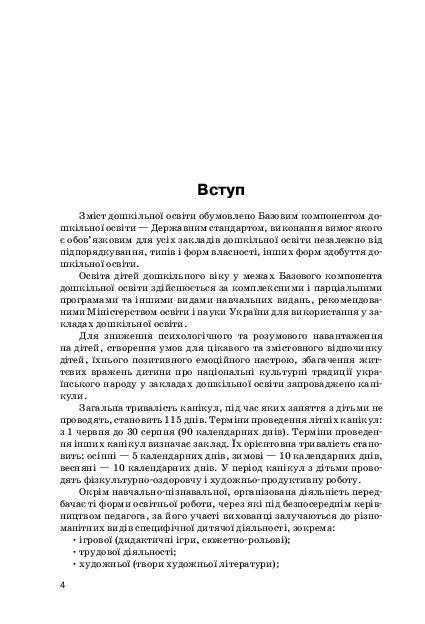 Методичний посібник містить перспективне планування освітнього процесу з дітьми молодшого дошкільного віку (4-й рік життя) закладу дошкільної освіти під час канікул. Розроблено орієнтовний розклад занять на період осінніх, зимових, весняних канікул та конспекти занять з фізичного розвитку та художньо-продуктивної діяльності.