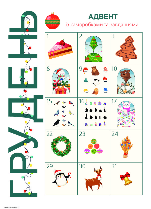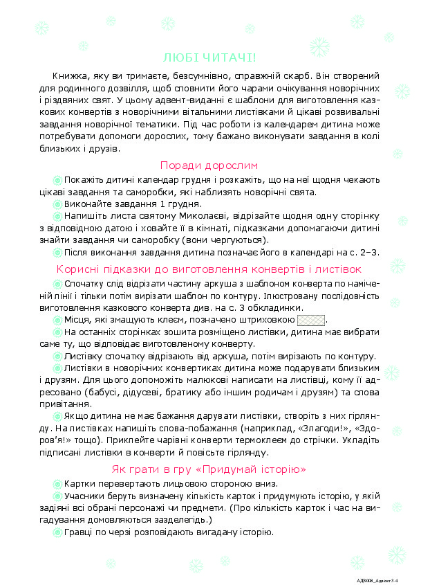 Друге, виправлене й перероблене, видання адвент-зошита створене, щоб сімейне дозвілля напередодні зимових свят стало незабутнім! Тут є шаблони для виготовлення казкових конвертів з новорічними листівками, цікаві розвивальні вправи для занять у колі близьких та друзів. Кожна саморобка перетворюється на конверт з листівкою, якими можна привітати родичів чи знайомих або скласти у святкову гірлянду й прикрасити нею оселю.