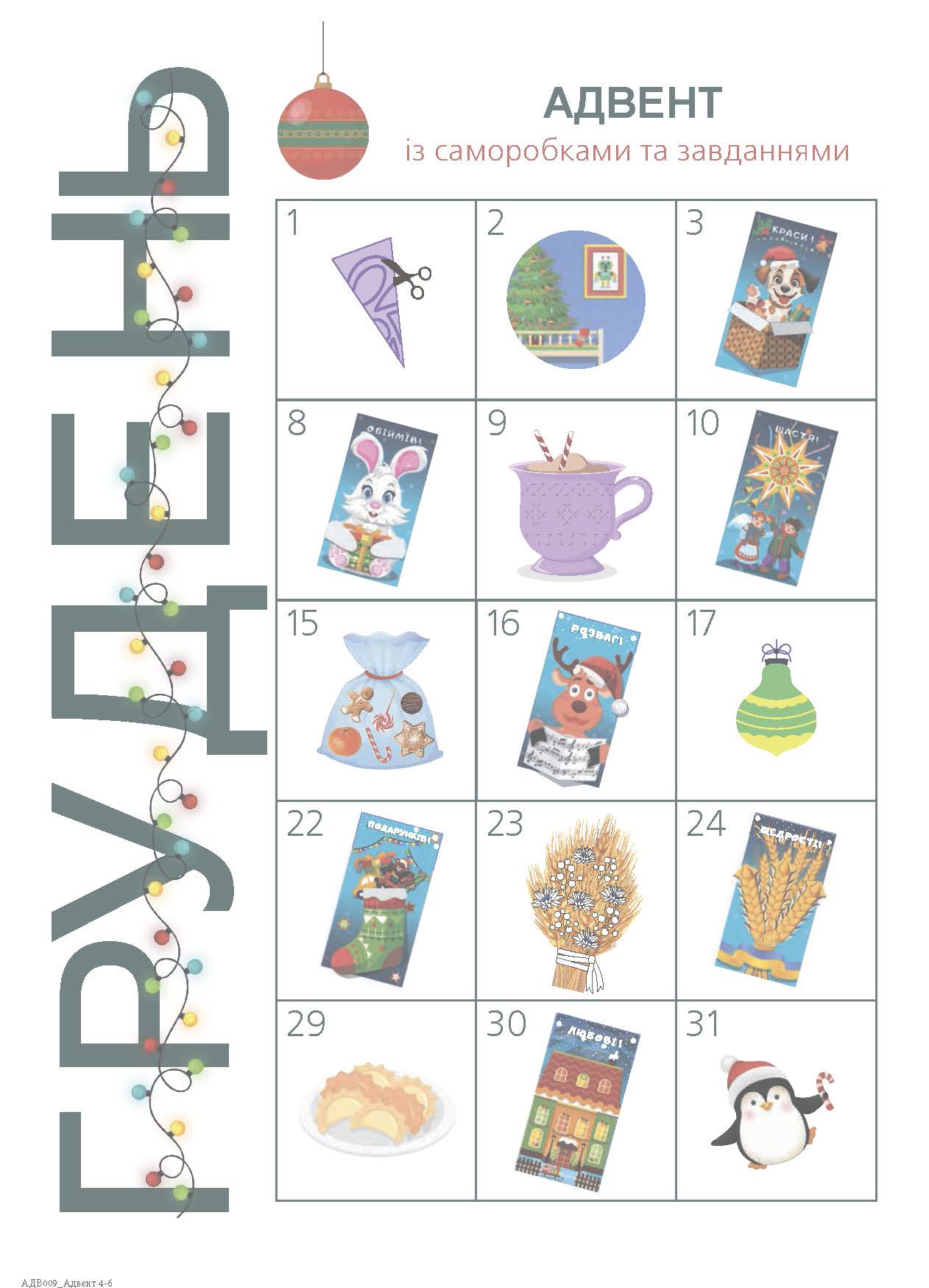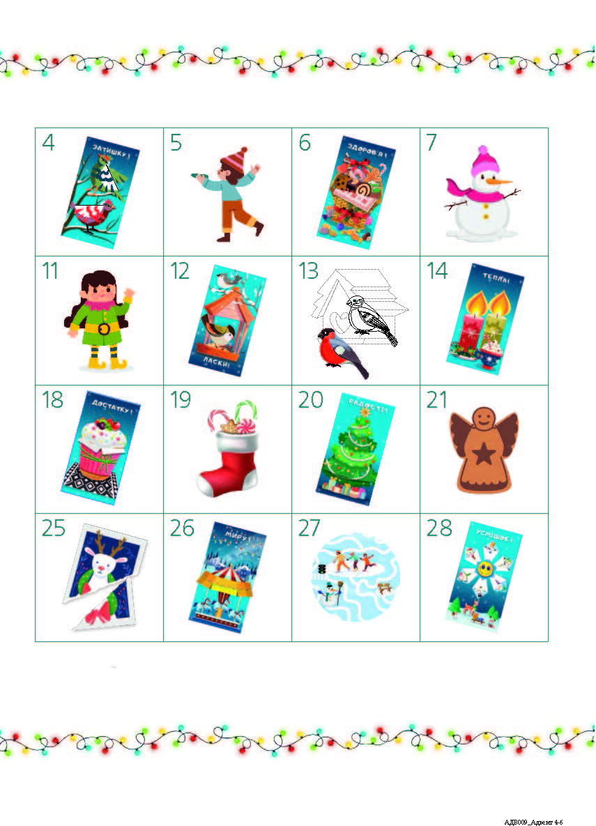 Друге видання адвент-зошита, виправлене й перероблене, призначене, щоби сімейне дозвілля напередодні зимових свят стало незабутнім! Тут є шаблони для створення новорічних листівок, цікаві розвивальні вправи та багато корисних ідей для занять у колі близьких та друзів. Саморобки перетворюються на листівки, які можна подарувати рідним та друзям, або створити з них святкову гірлянду й прикрасити оселю.