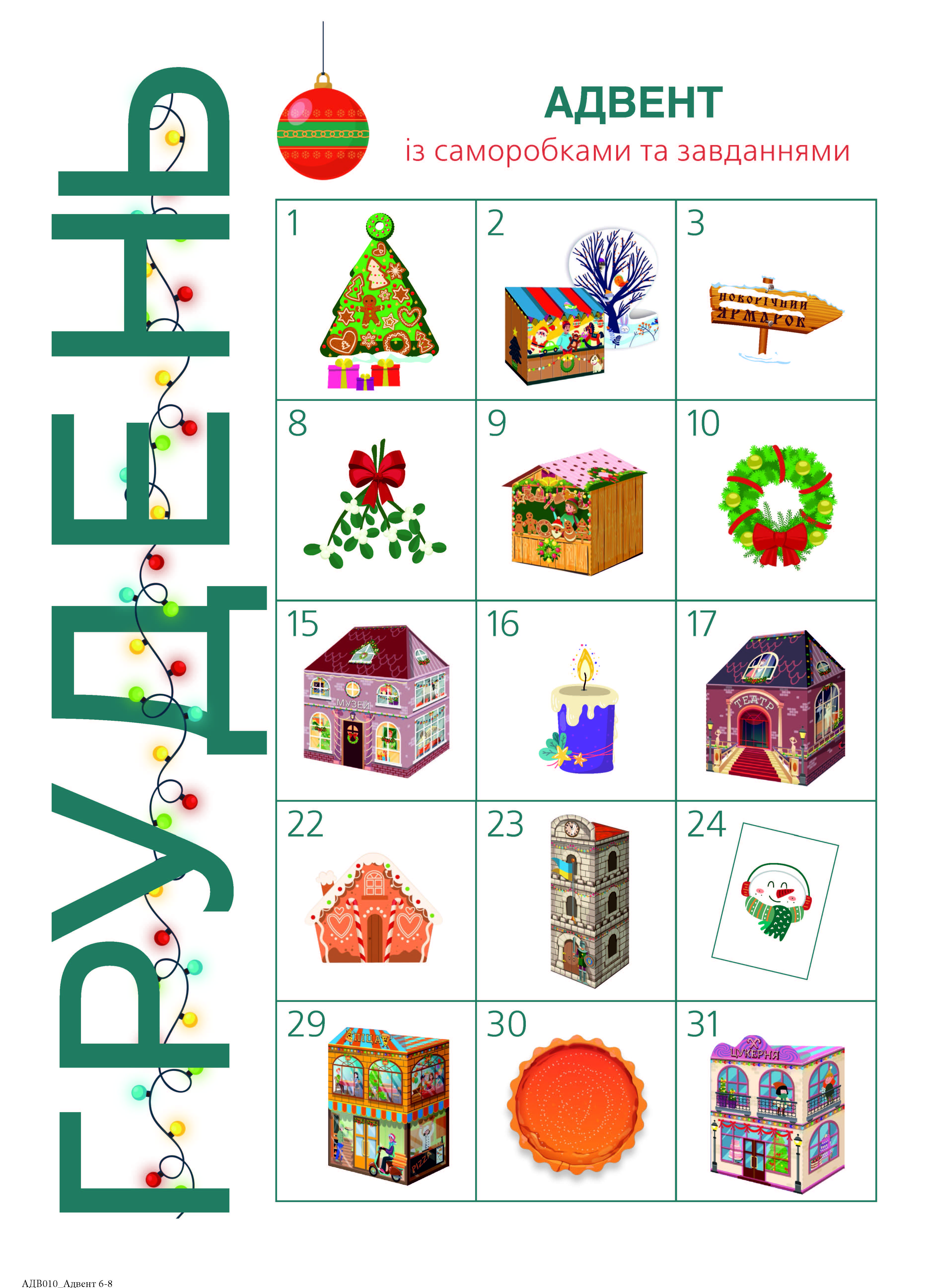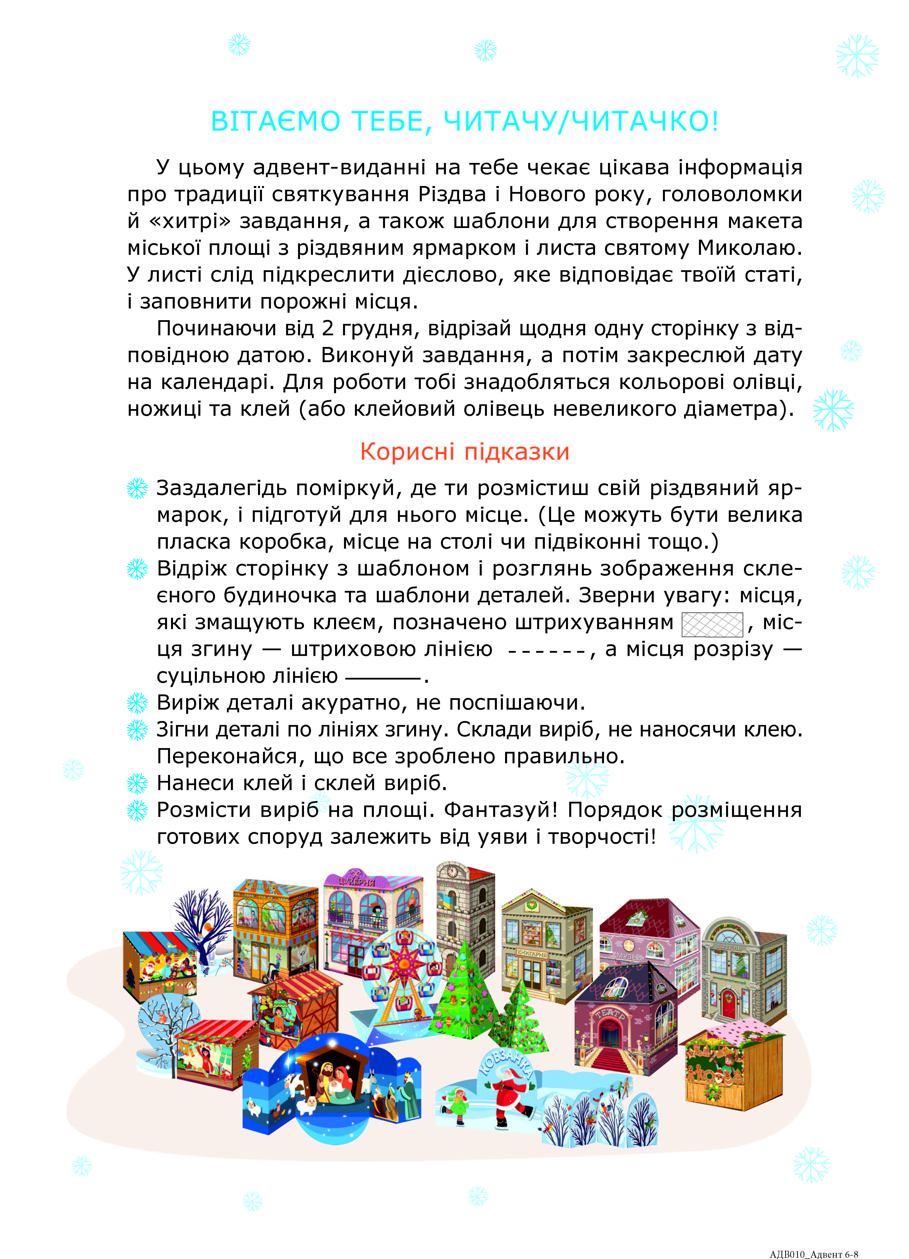 Друге, виправлене й перероблене, видання адвент-зошита створене, щоби сімейне дозвілля напередодні зимових свят стало незабутнім! Тут є шаблони для створення саморобок, цікаві вправи на розвиток логічного мислення та лабіринти, головоломки та цікава інформація про традиції святкування Різдва та Новічних свят у країнах світу. Кожна саморобка перетворюється на макет споруди або будівлі, з яких можна створити міську площу з різдвяним ярмарком, що стане окрасою вашої оселі на свята.