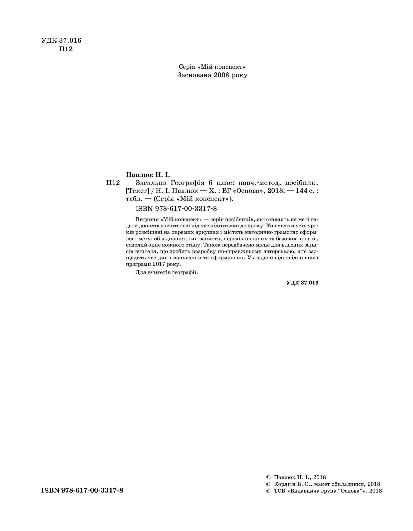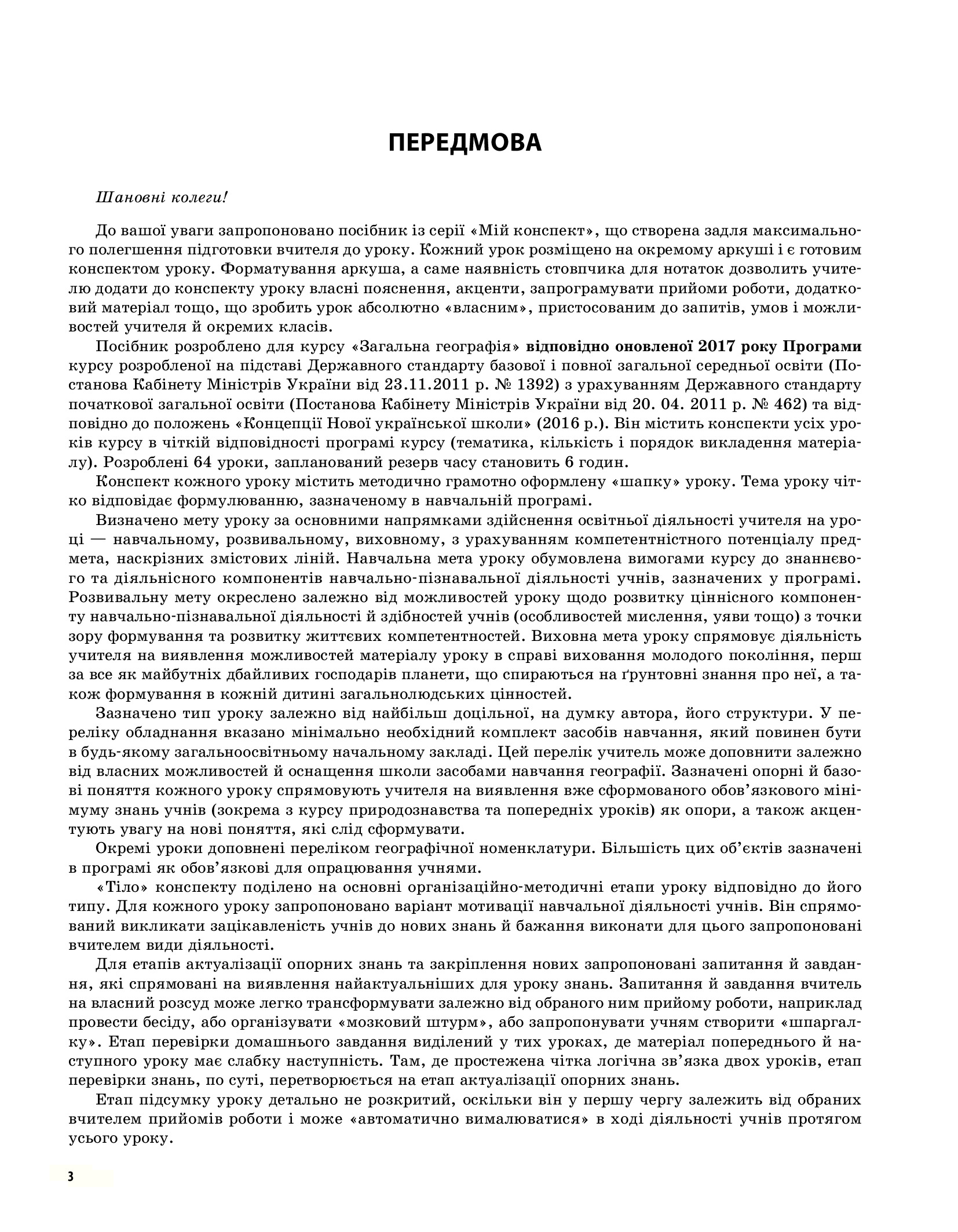 Видання «Мій конспект» — серія посібників, які ставлять на меті надати допомогу вчителеві під час підготовки до уроку. Конспекти усіх уроків розміщені на окремих аркушах і містять методично грамотно оформлені мету, обладнання, тип заняття, перелік опорних та базових понять, стислий опис кожного етапу. Також передбачено місце для власних записів вчителя, що зробить розробку по-справжньому авторською, але заощадить час для планування та оформлення. Укладено відповідно нової програми 2017 року.