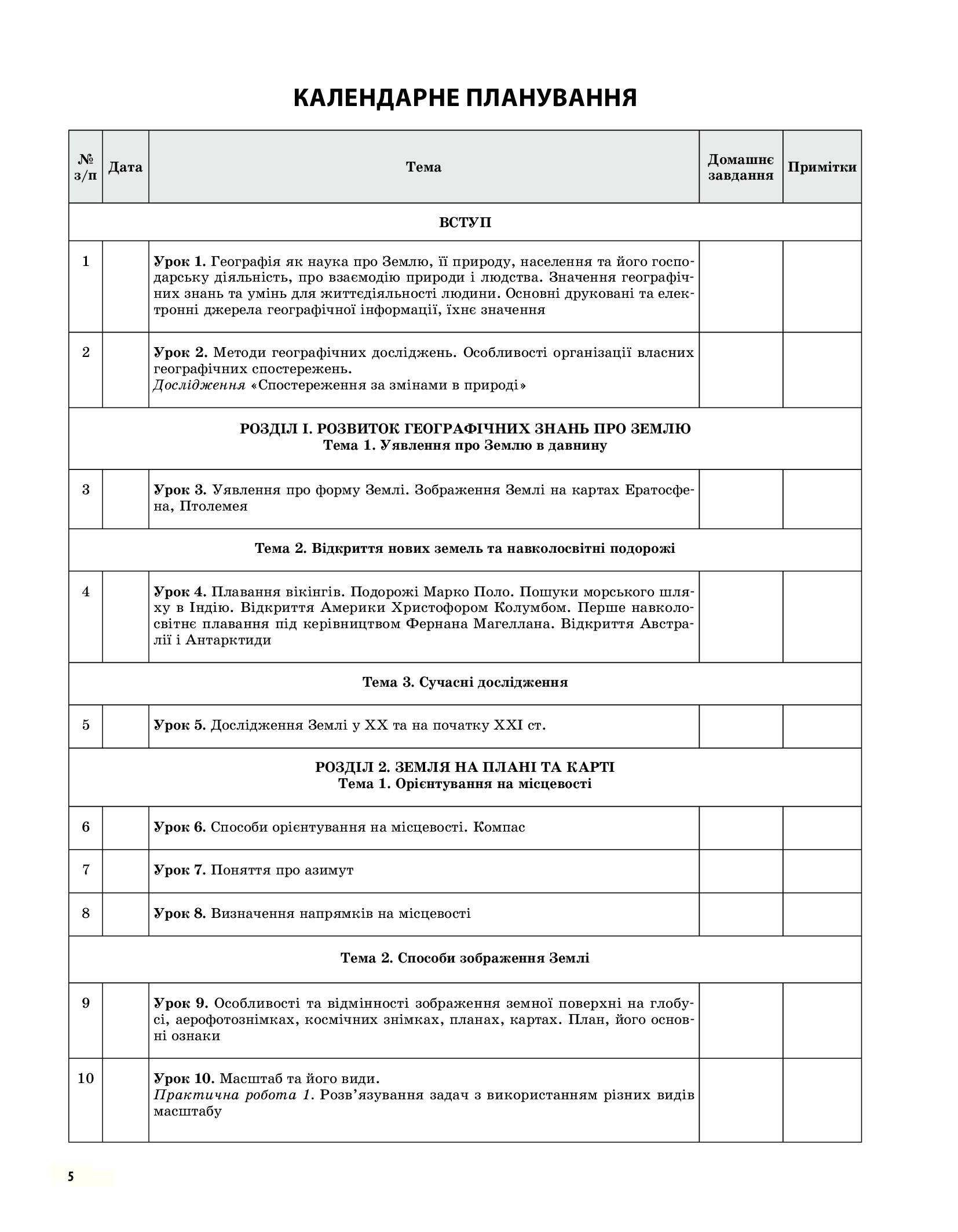 Урок 18. Підсумковий урок за розділами «Вступ», «Розвиток географічних знань про Землю», «Земля на плані та карті» . . . . . . . . . . . . . . . . . . . 45